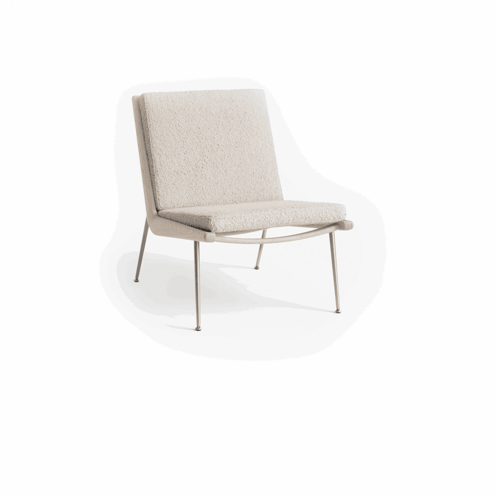 Boomerang Lounge Chair HM1 Back & seat UPHOLST cushions Oiled oak frame Stainless steel legs Plastic gliders