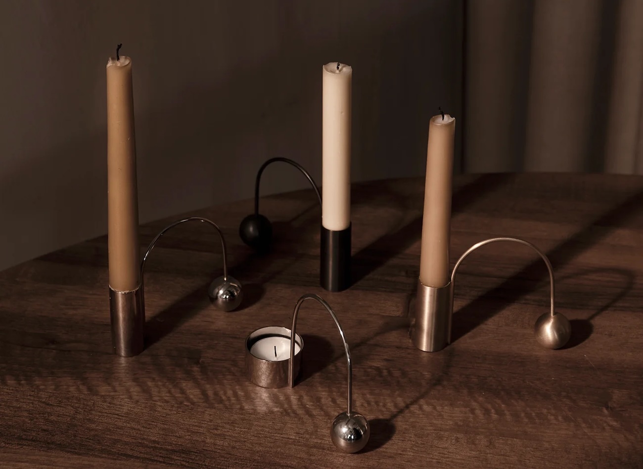 The Balance Candle Holder displays an exercise in mastering the art of balance, each part counter-weighing the other to reach a moment of tranquil stillness. The geometrical shapes are both sculptural and functional, as the arch may be used as a handle to carry the candle holder.