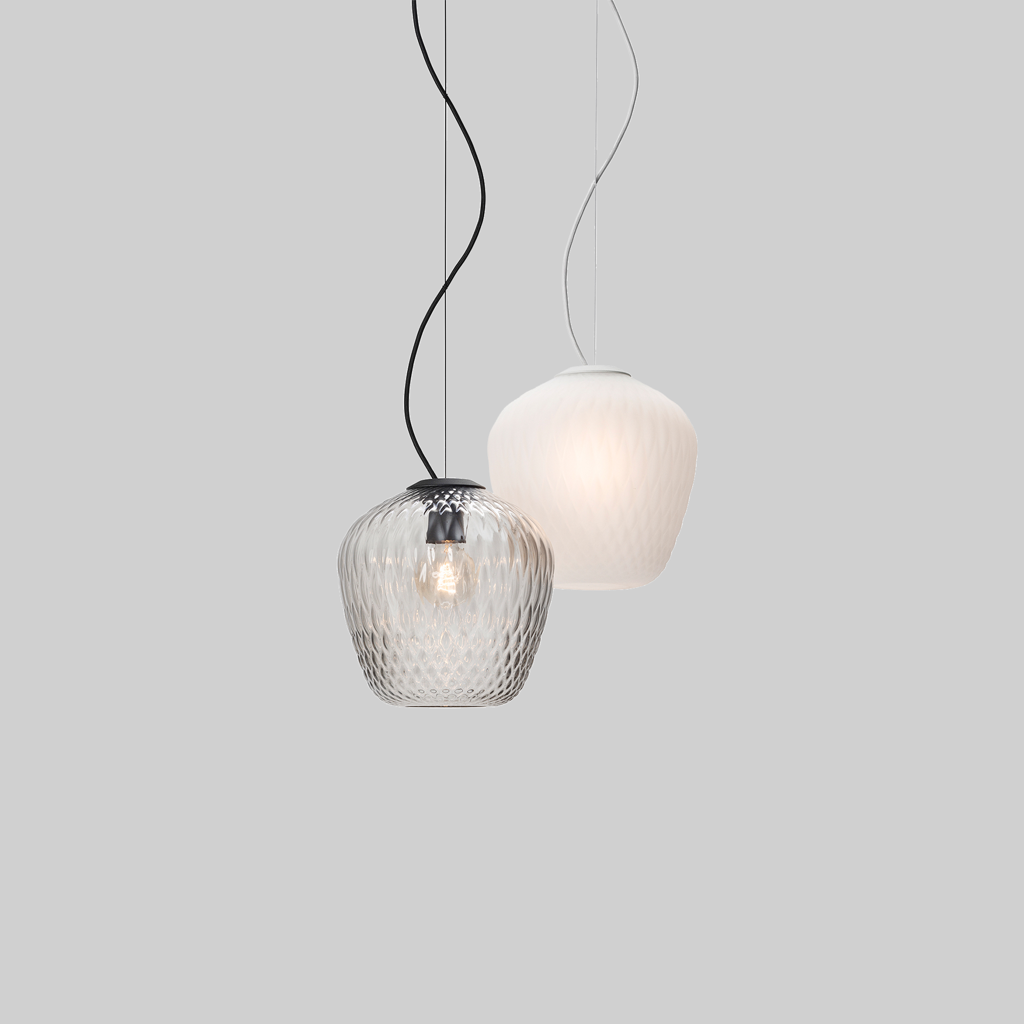 Blown is Samuel Wilkinson’s first lamp for &tradition. A mouth-blown pendant with a quilted pattern, it comes in two versions: a translucent variant with a silver lustre and a sandblasted white one. The pendant is fitted with a powder-coated cast metal suspension. The pendant was conceived as an exploration of the reflections, distortions, and refractions of a light source when surrounded by patterned glass.