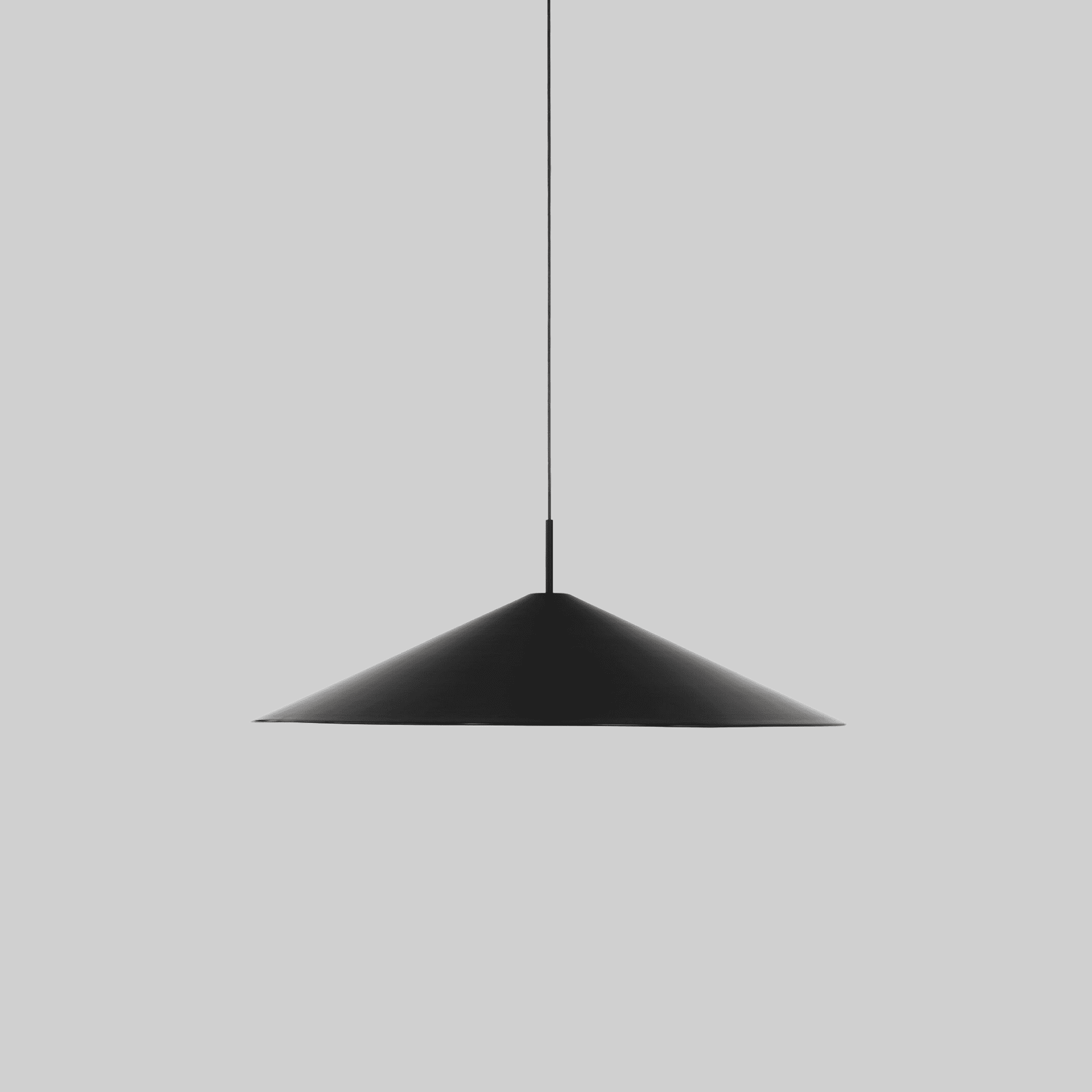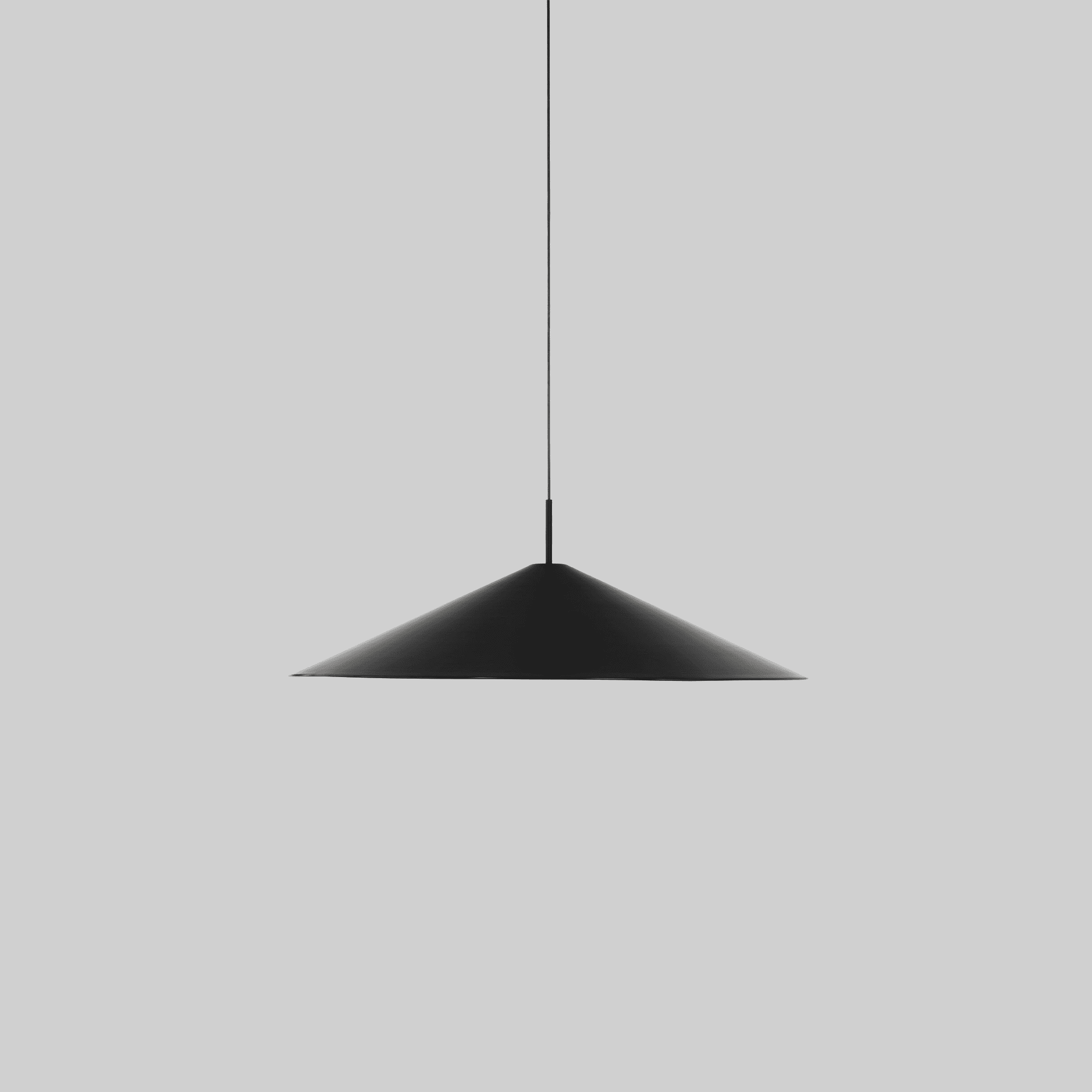 The Brolly lighting series demonstrates the strength of simplistic shapes. Precise and considered, these elegant lights display the kind of thoughtful, almost deceptive, simplicity that makes them timeless particulars in any decor. In this pendant version of the Brolly Lamp, the conical lampshade is magnified into diameters of 70 and 90 centimetres, their sharp volumes enhancing the architectural expression of the design. The concave diffuser spreads a soft and generous light that does not blind you when you are seated beneath the lamp. Let the pendant hover above the dining table or wherever pleasant light and a significant silhouette are sought.