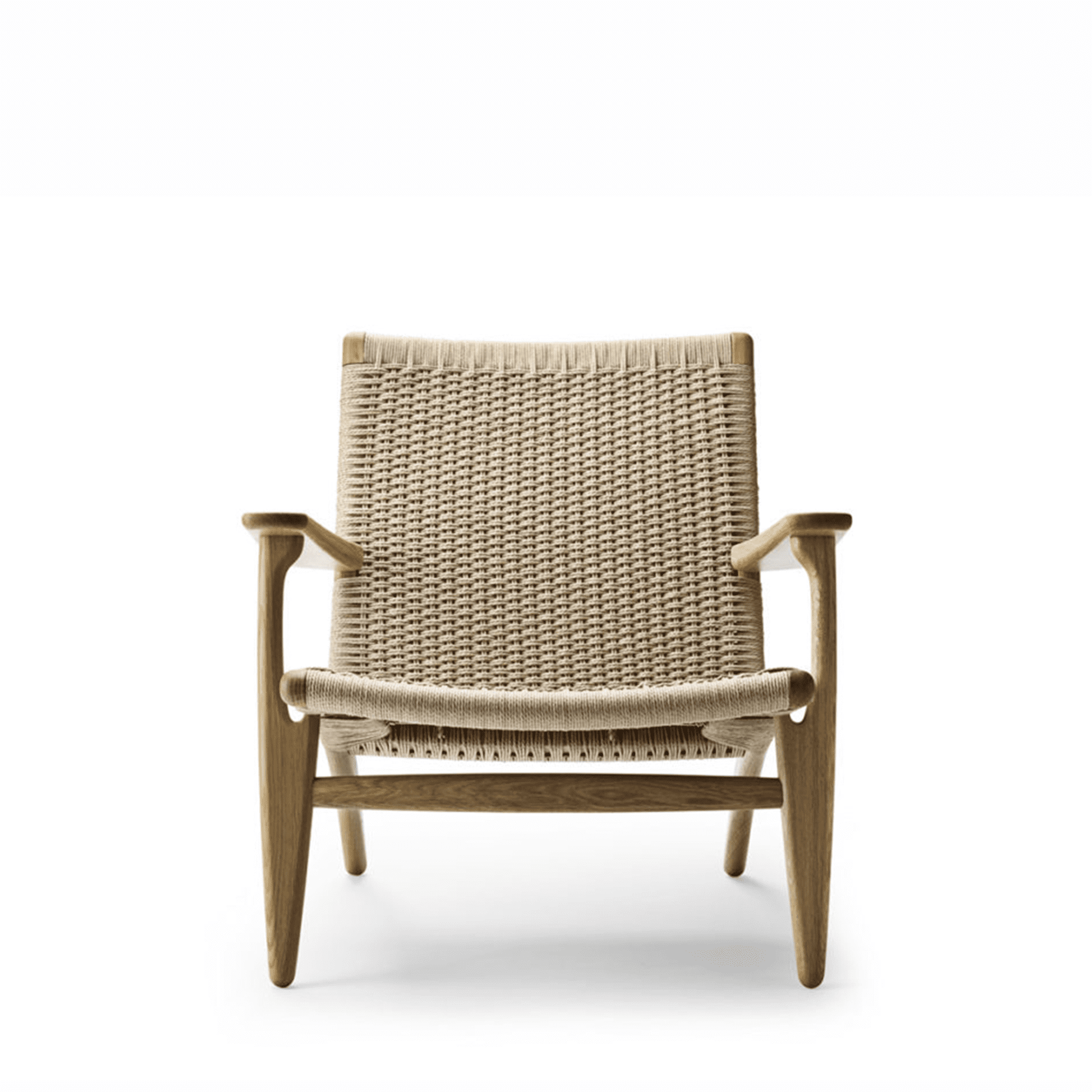 The CH25 lounge chair, like many of Hans J. Wegner’s other iconic designs, is ambitious and bold in its sculptural shape. It also caused a stir, however, with its materials. Wegner’s choice of woven paper cord – a wartime substitution material – for the seat and back was unheard of at the time. But Wegner liked the look and durability of the material, and so have generations of his fans. The CH25 lounge chair has remained extremely popular and in continuous production ever since: a testament to Wegner’s visionary approach. It takes a skilled craftsman 10 hours to complete one chair seat and back by hand, using about 400 meters of paper cord and a double weaving technique that creates the chair’s unique pattern – the striking result of this detailed process is a unique chair that is equally beautiful and inspiring from all angles.