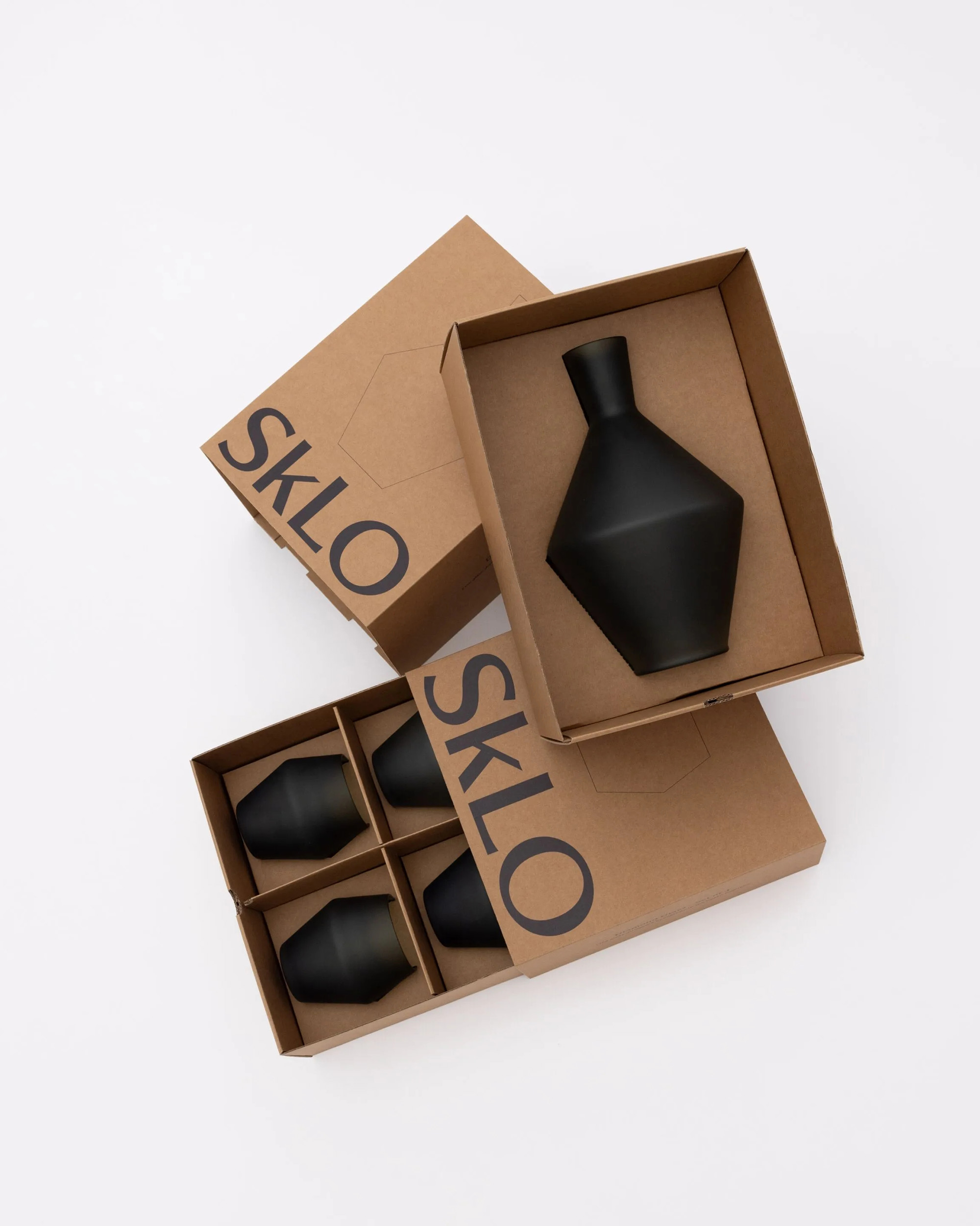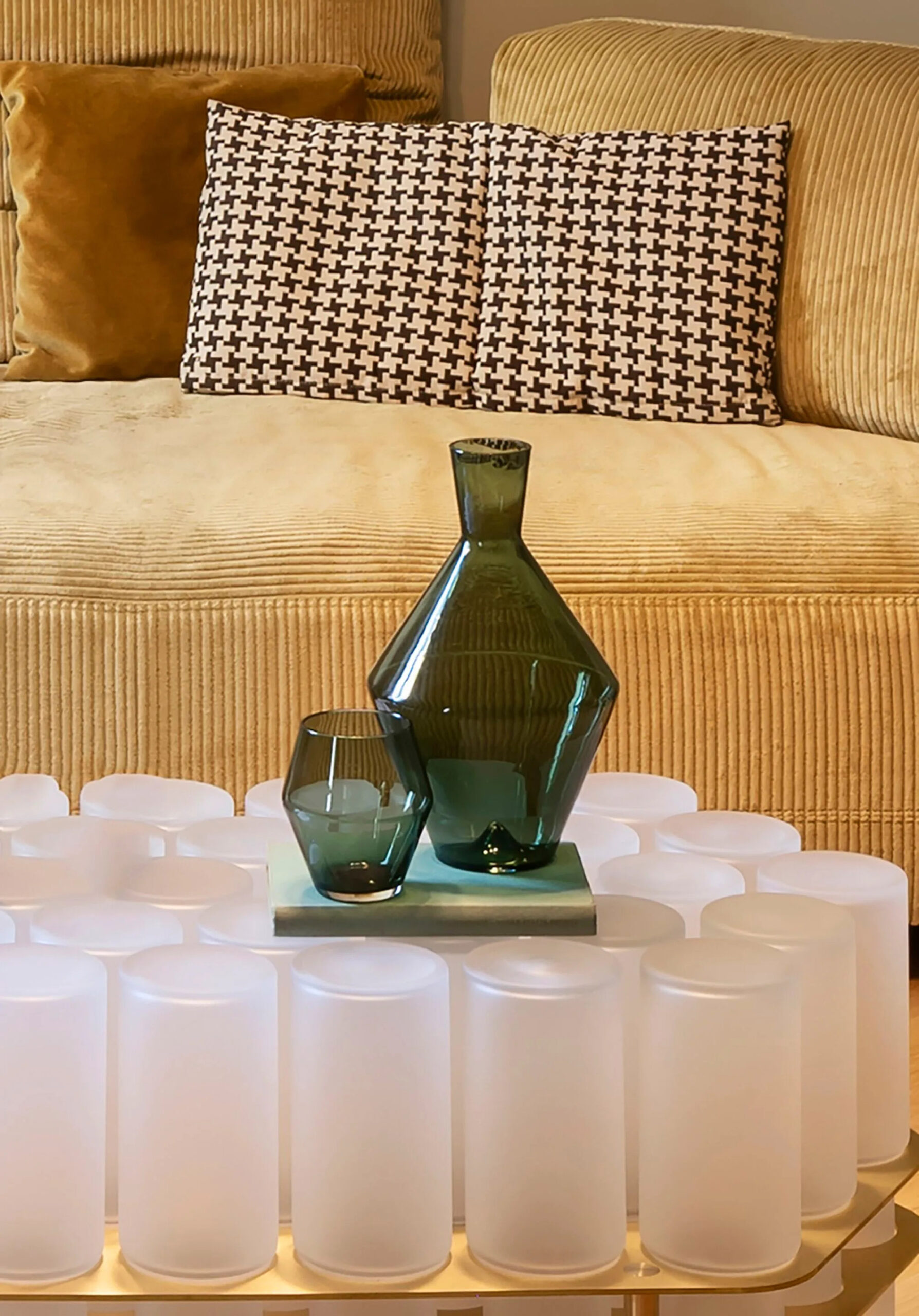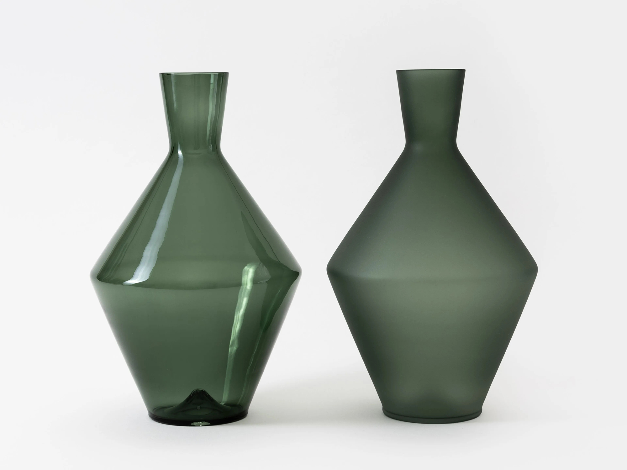 The angular shape of the Diamond Decanter is both playful and chic, with a mid-century charm. Carefully proportioned, it is both beautiful and functional. Available in three vibrant, transparent glass colors, with both frosted and standard finishes. Each piece is individually handblown from the finest glass. Subtle variations in color density are an intentional expression of its handmade origins.
