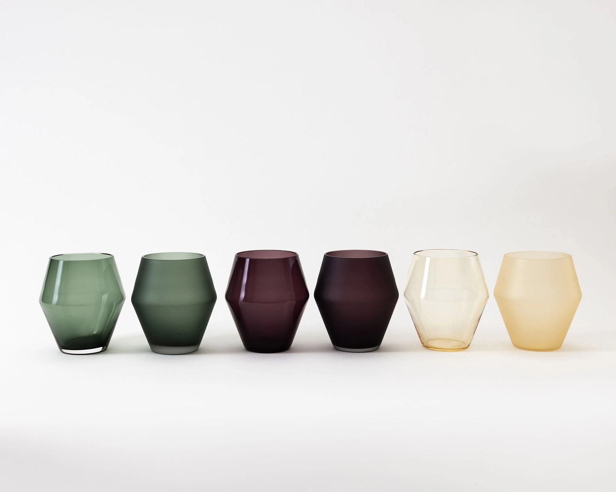 The angular shape of the Diamond Glass is both playful and chic, with a mid-century charm. Its well-balanced proportions make it sculptural when on display and a pleasure to use. Perfectly sized for wine, water, or cocktails. Available in three vibrant, transparent glass colors, with both frosted and standard finishes. Each piece is individually handblown from the finest glass. Subtle variations in color density are an intentional expression of its handmade origins. Sold in sets of four.