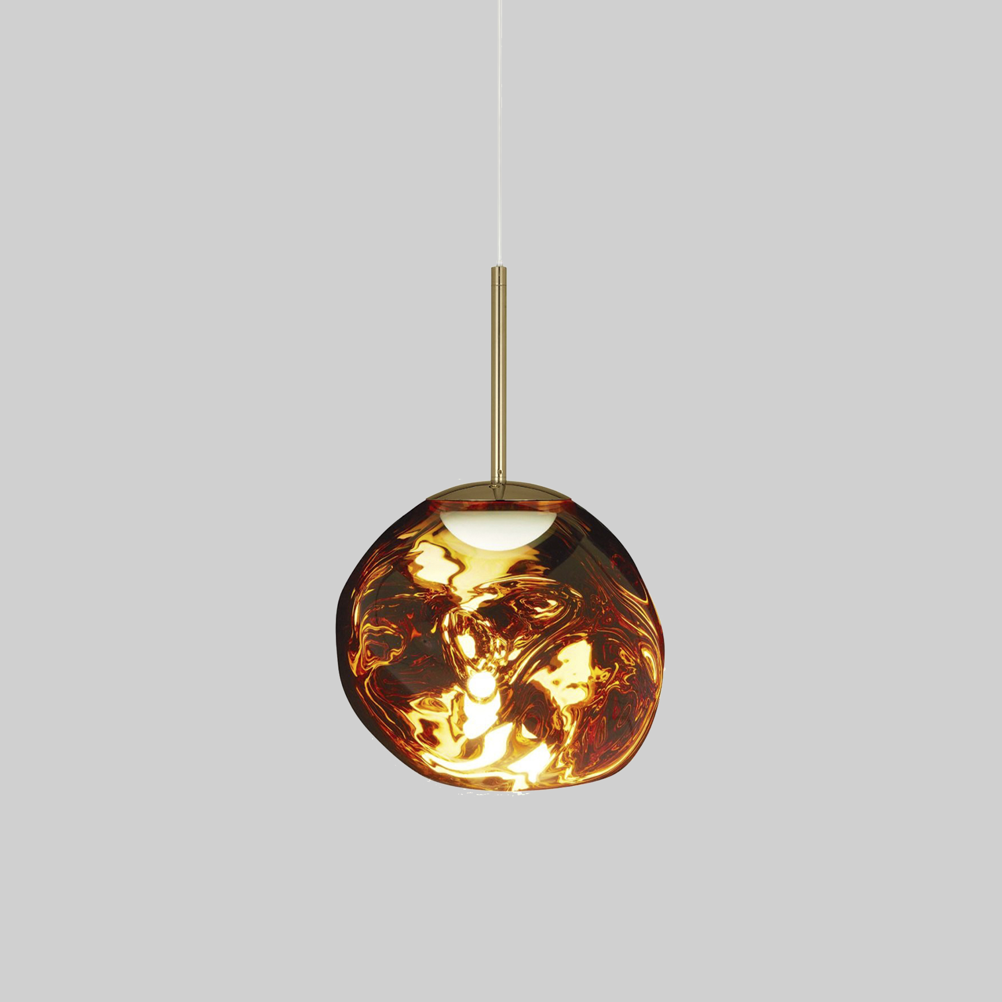 Melt is evocative of molten glass, the interior of a melting glacier or images of deep space. An imperfect, organic and naturalistic light that produces a mesmerizing hot-blown glass effect. Melt is created through a process of blow moulding and vacuum metallisation to achieve melted orbs with abundant and unusual luminosity. Here the orb sits on a cone-shaped base creating a striking silhouette.