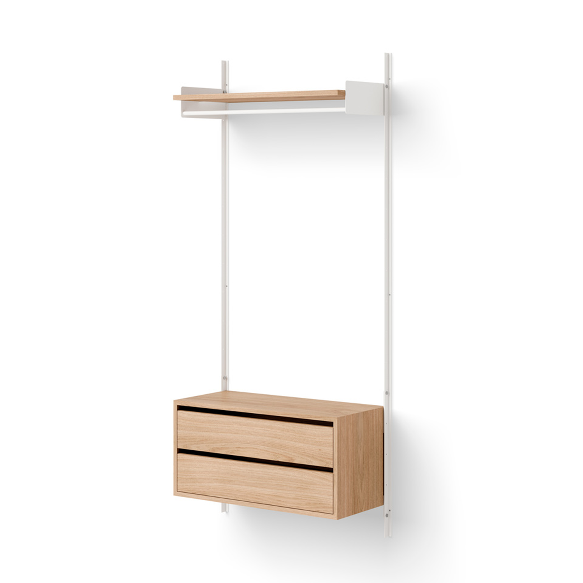 With new elements for the storage of clothing, the New Works Shelving System enters the hallway and wardrobe, adding a refined appearance to otherwise practical furniture pieces. A combined hat shelf and hanger, a slanted shelf for shoes, and a coat rack can be combined with the system’s wall bars and shelves to create organised and attractive open storage solutions. With the same elevated simplicity in the Details, which characterises the shelving system, your wardrobe wall shelf will appear as a beautiful whole.