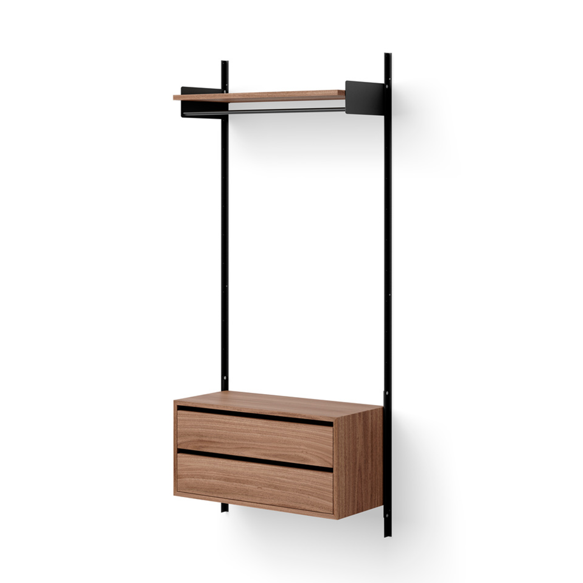 With new elements for the storage of clothing, the New Works Shelving System enters the hallway and wardrobe, adding a refined appearance to otherwise practical furniture pieces. A combined hat shelf and hanger, a slanted shelf for shoes, and a coat rack can be combined with the system’s wall bars and shelves to create organised and attractive open storage solutions. With the same elevated simplicity in the Details, which characterises the shelving system, your wardrobe wall shelf will appear as a beautiful whole.