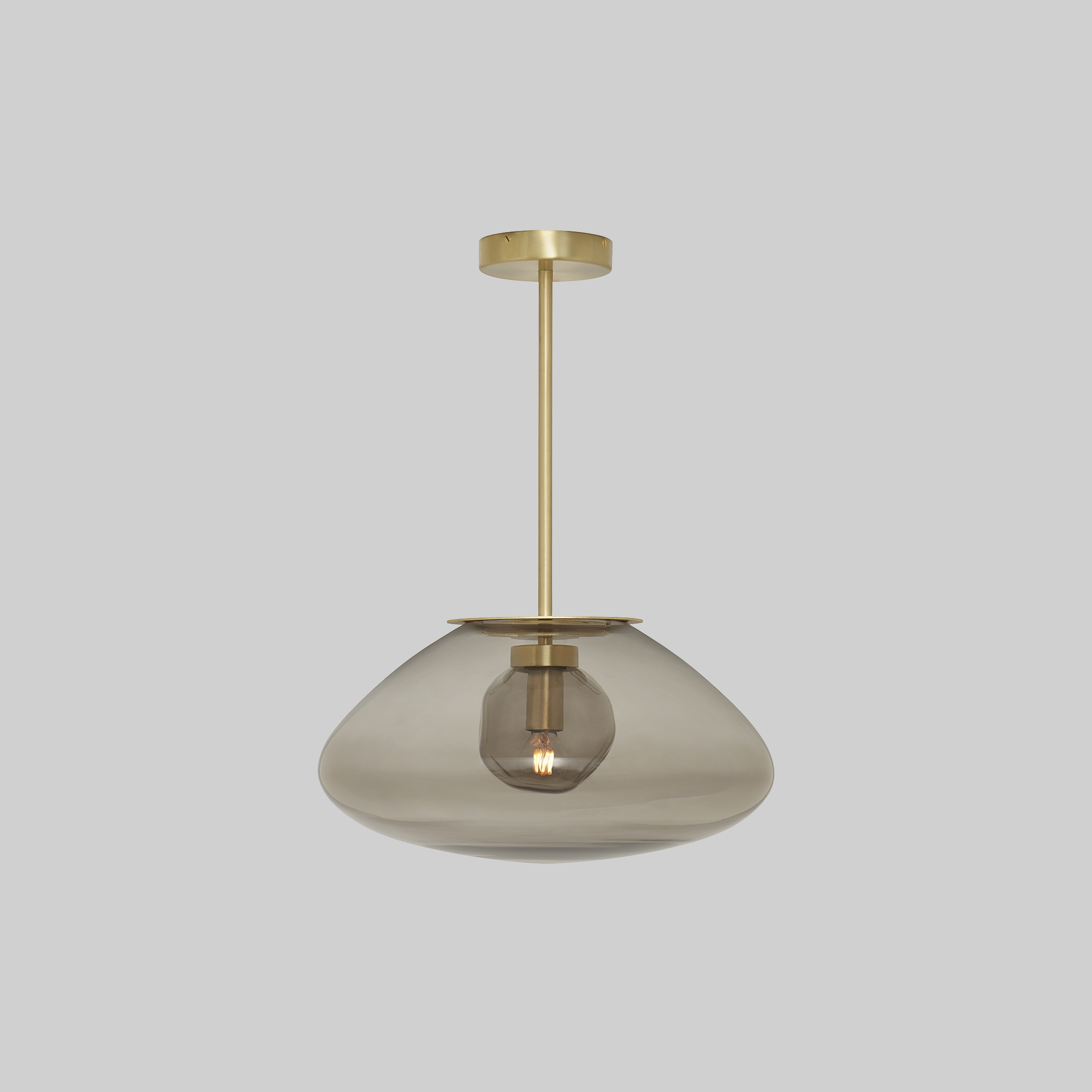 Marveling at the myriad of glass masters from Murano where this remarkable material has been produced for centuries with artisan skills, and exploring both the duality between the fragility and powerful organic matter of glass, we designed Petra; a pendant light that perfectly combines the delicacy and the strength of our natural world. Description Outer mouth blown smoked glass pendant, hand shaped tinted or matt opal finish inner shade, stain brass or bronze metal drop rod.