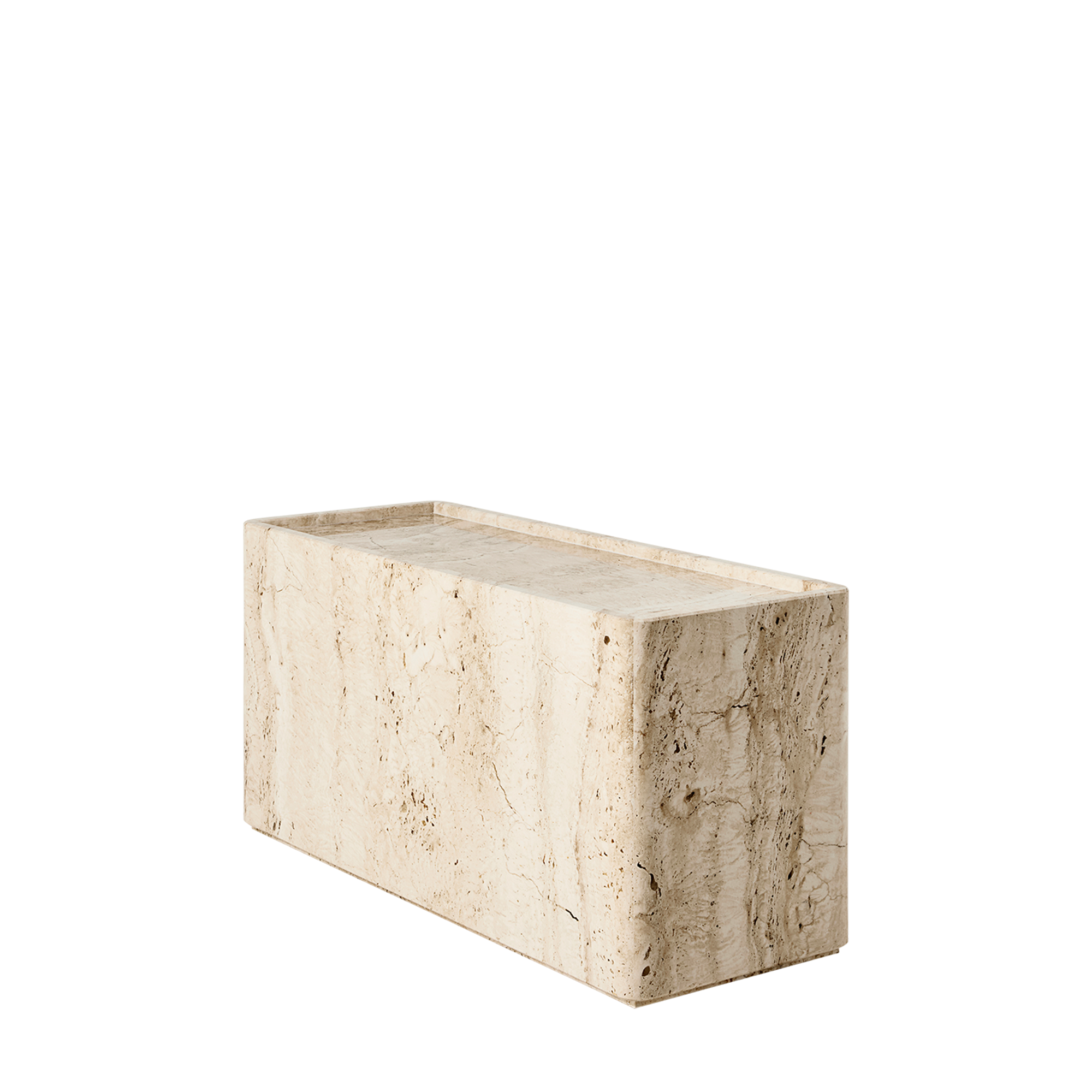 Continuing GamFratesi’s material exploration of travertine that began with the Epic and Doric Tables, the Pietra Side Tables celebrate the mesmerizing patterns found in the surface of the stone. Available in two sizes and two colors, the tables are deceptively lightweight, each constructed by hand from six pieces but resembling solid blocks. A raised lip around the gently curving edge of the tabletop creates a useful tray-like surface, ideal for displaying objects or placing a glass securely. Carefully cut, fitted, and finished, the curved edges and corners exemplify the extraordinary level of craftsmanship behind the table, and imbue the stone with a sense of softness.