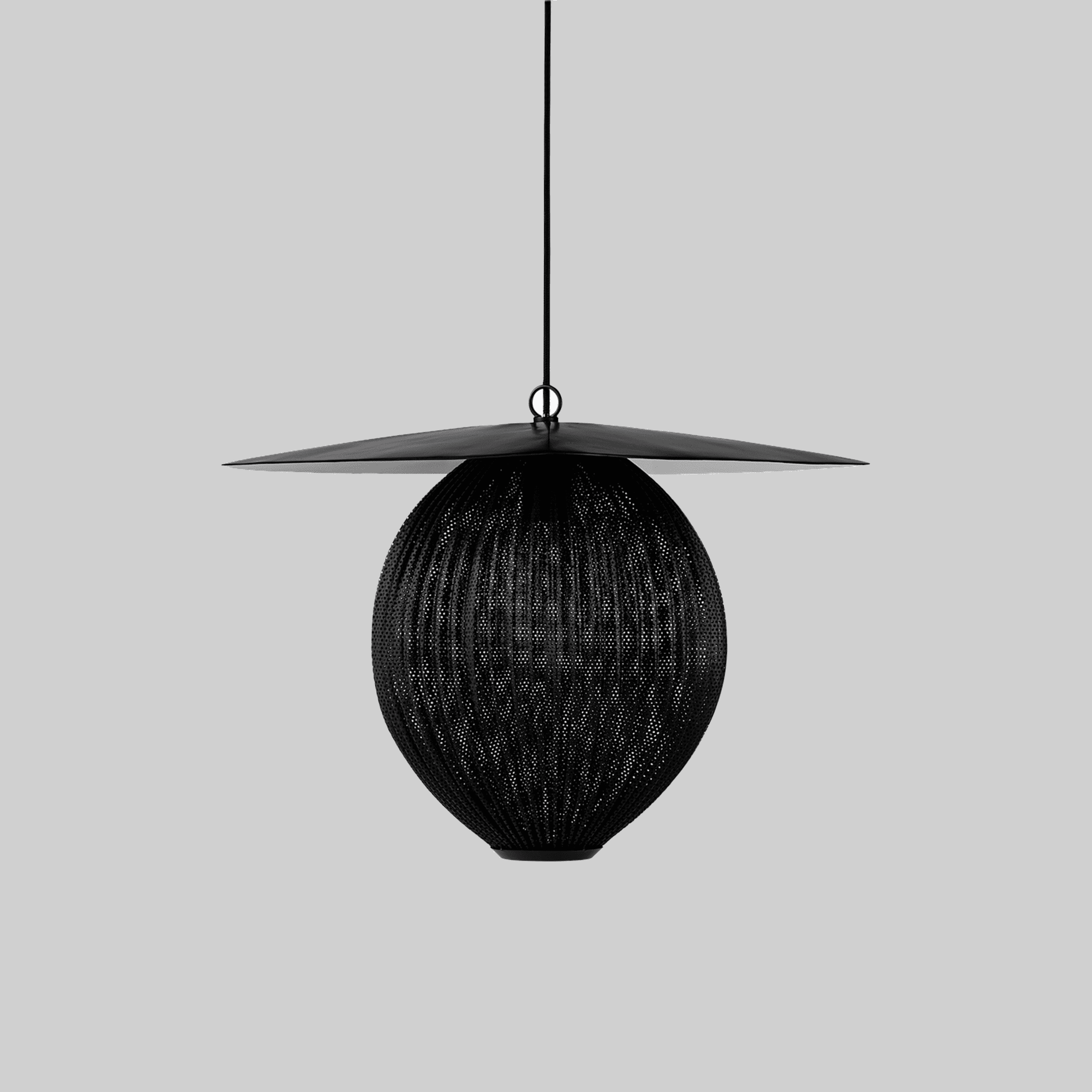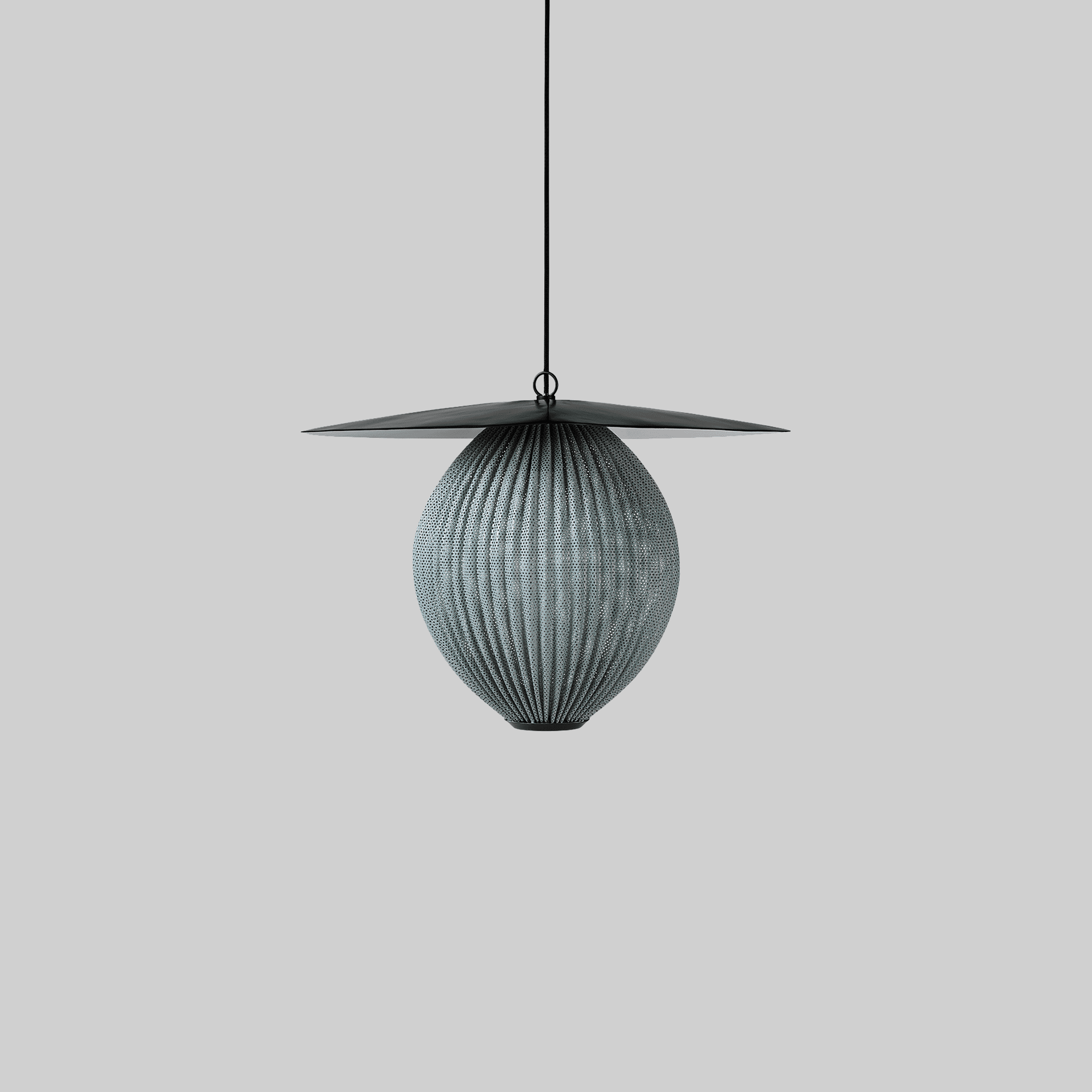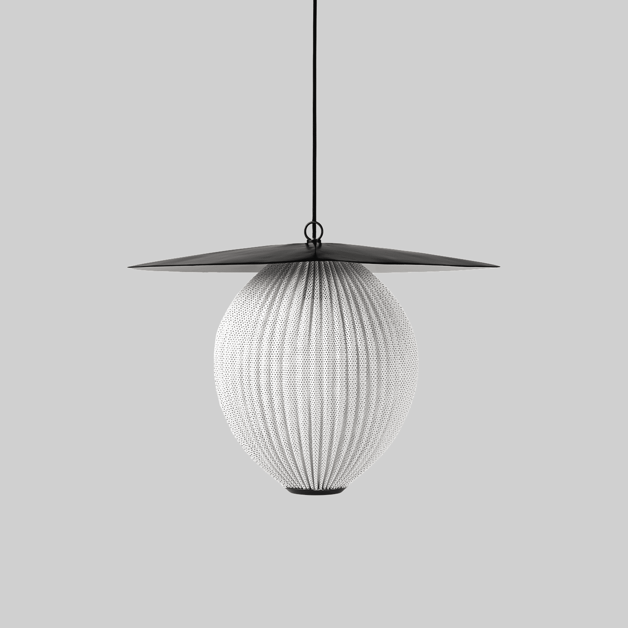The Satellite Pendant of two sizes is designed by Mathieu Mategot in 1953 with geometrical shapes and an organic shade to create outstanding sculptural aesthetics. The name, Satellite, was given by Mategot as a wink and tribute to the scientific progress in France in the years after the Second World War.The Satellite Pendant holds the distinctive trait of Rigitulle, a technique and material invented by the designer himself that makes it possible to bend and fold the fabric-like metal sheet to an original, oblong-shaped pendant lamp. The lampshade has five colour options; midnight black, white cloud, shy cherry, venetian gold and rainy grey, and is unique with its bulb all covered by perforated metal to exude an atmospheric light – creating a festive appearance. The interplay of light and shadow cast on walls and floors generate a dramatic feature in any dining room, hallway or restaurant. Hang the Satellite Pendant alone as a character piece or in multiples to create a cloud of luminosity.