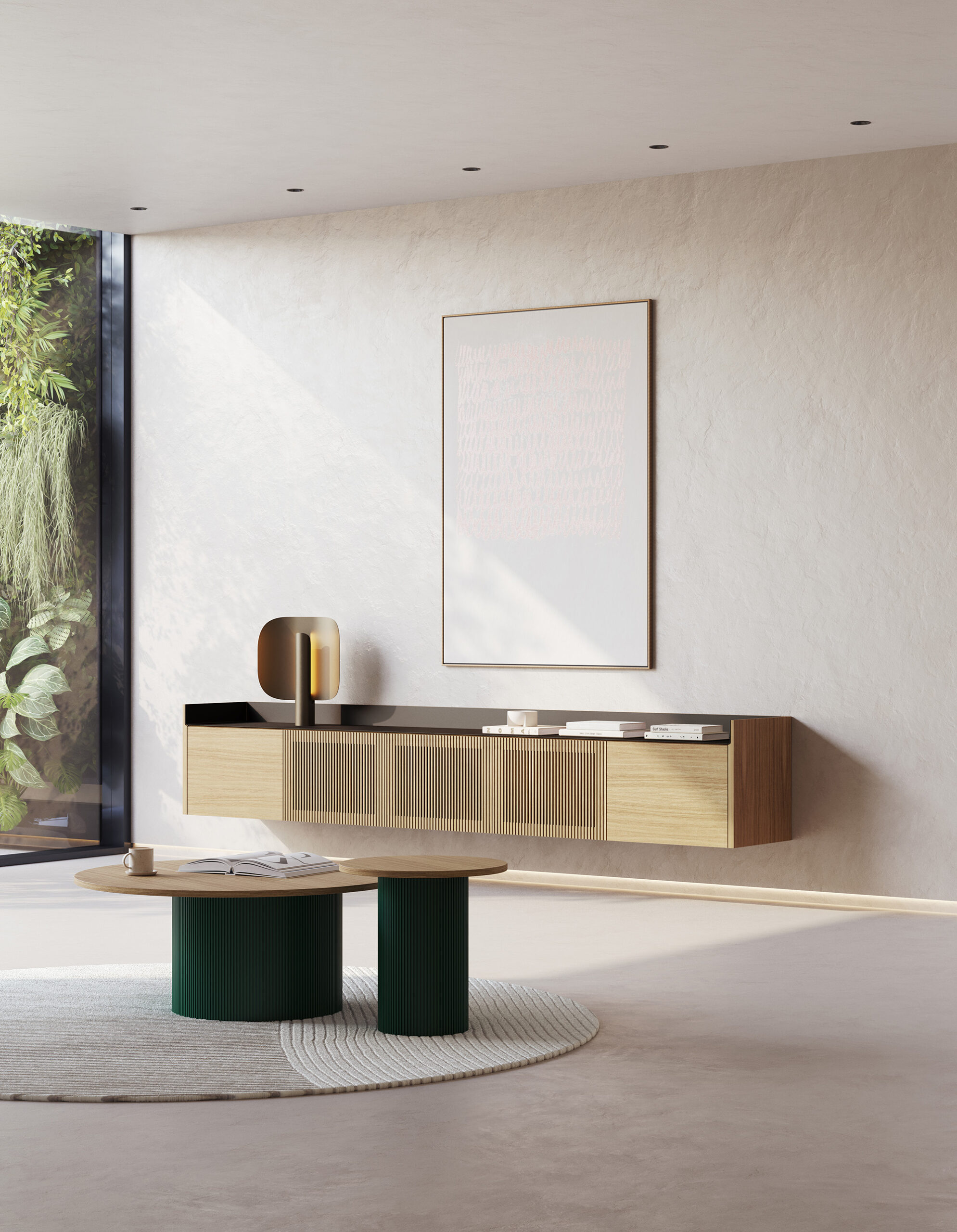 A piece of furniture leaning on a plinth, on adjustable feet or hanging from optional wall-fixing devices.